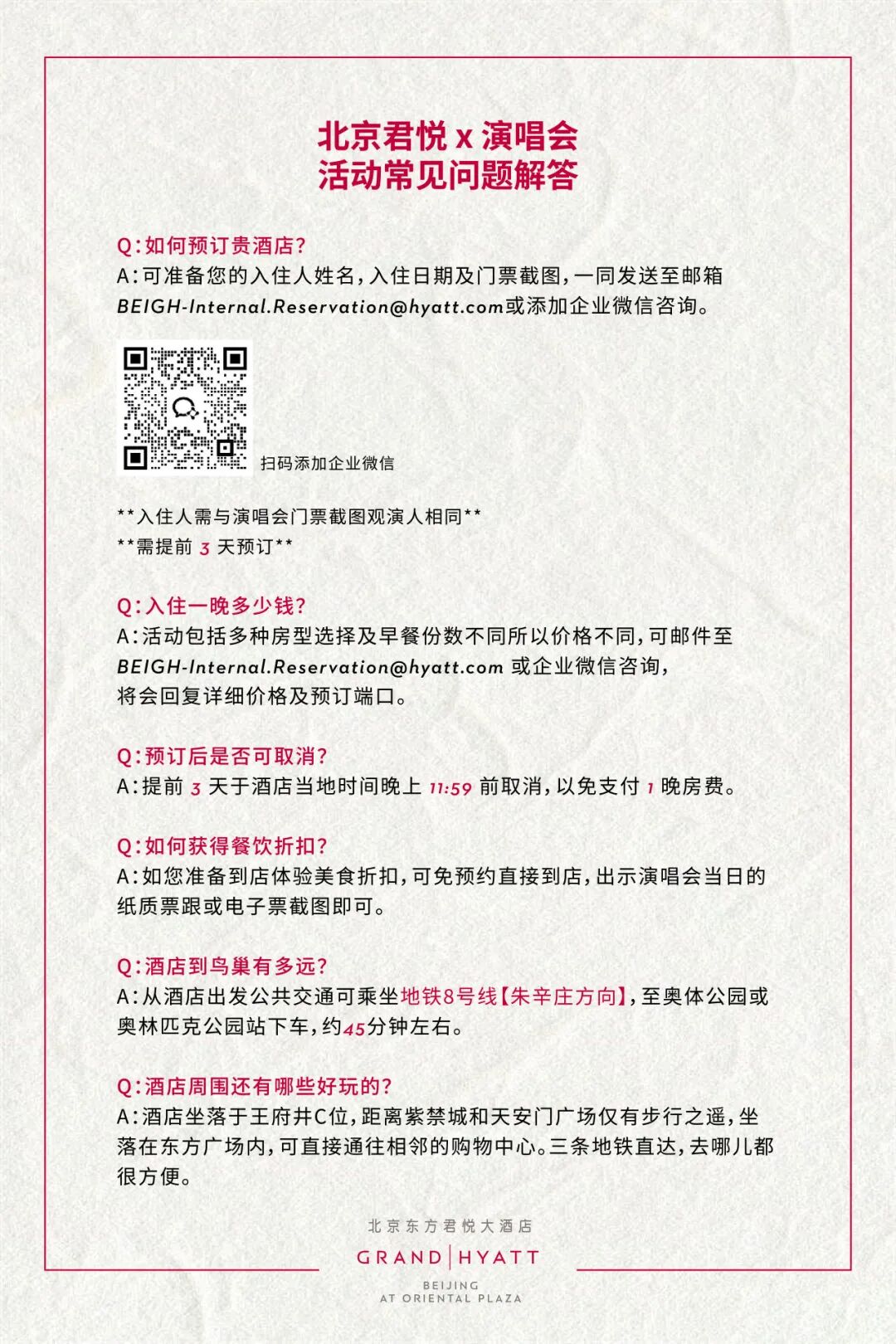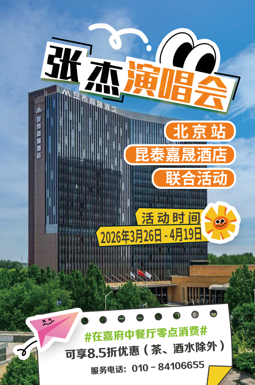 🎶 专属优惠详情 •对象:2026年张杰演唱会北京场的观众•力度:客房预订享9.5折,餐饮9折 • 适用日期:2026年3月27日至4月19日演唱会期间
