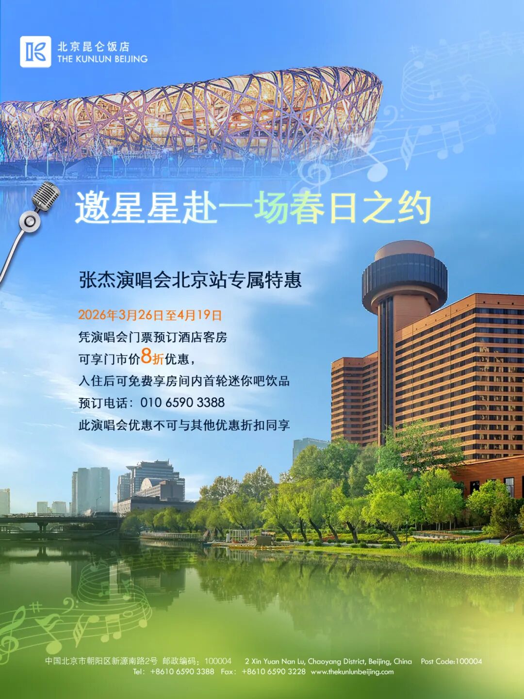 🎵 邀“星星”赴一场春日之约,住进音乐里的春天🌸。张杰「未·LIVE—开往1982」北京站 × 北京昆仑饭店专属礼遇上线。当春天的风吹过北京中轴线,万千星光即将在鸟巢汇聚,北京昆仑饭店为你预留最温柔的落脚处。