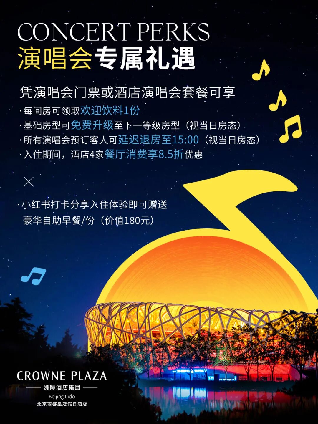 北京丽都维景酒店特别推出演唱会期间客房预订9.5折,餐饮门市价9折专属优惠,为您打造完美的观演住宿体验。