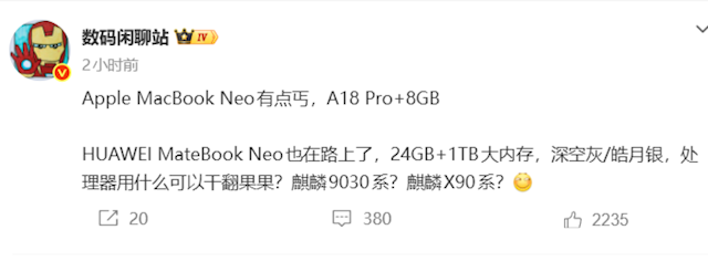 内存秒杀苹果MacBook Neo! 华为MateBook Neo要来了:24GB+1TB大内存 麒麟处理器